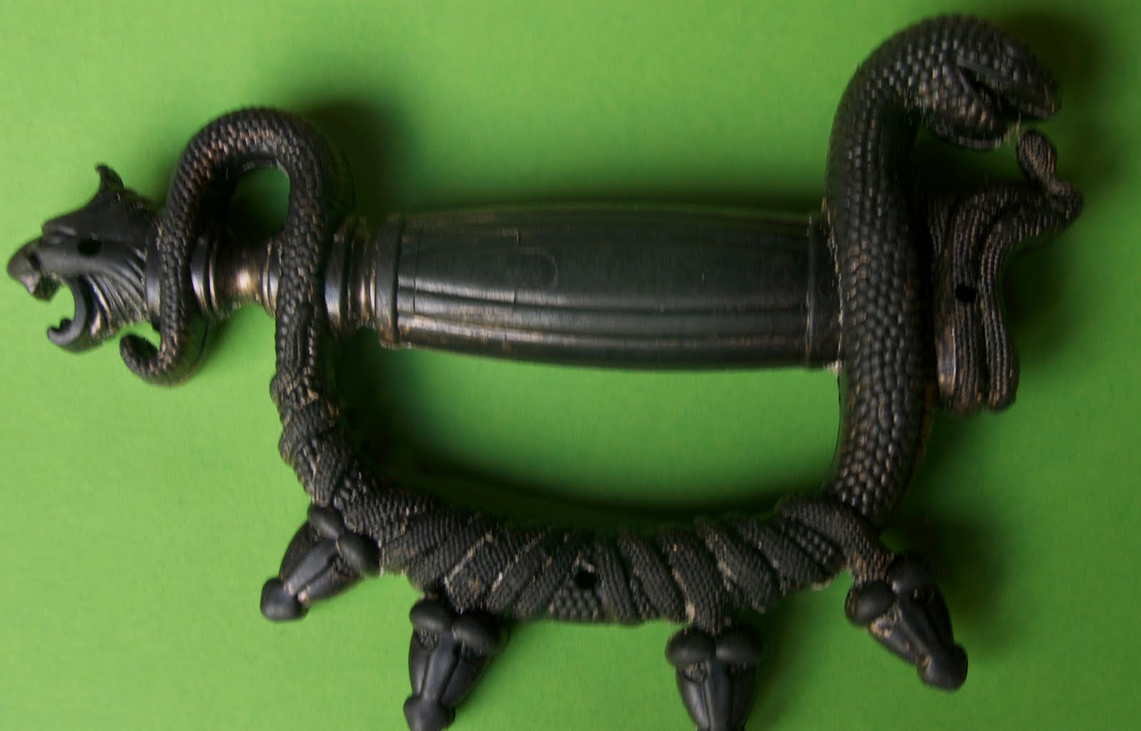 Era o elemento que faltaba no debuxo : unha espada cunha talla dunha serpe e un león.